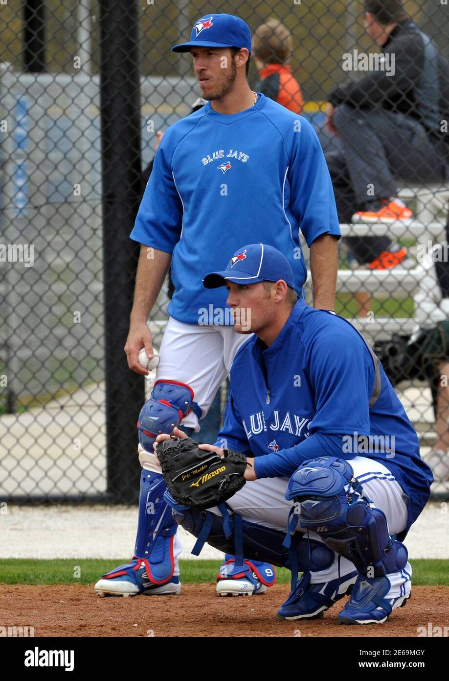 Toronto Blue Jays Catchers J P Arencibia Back And Jeff Mathis Watch A Drill During Practice At Their Mlb American League Spring Training Facility In Dunedin Florida February 26 2012 Reuters Mike Cassese United